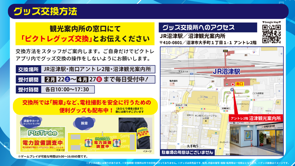 グッズ交換はJR沼津駅 南口アントレ2階 沼津観光案内所にて毎日、10:00から17:30まで交換を受け付けています。