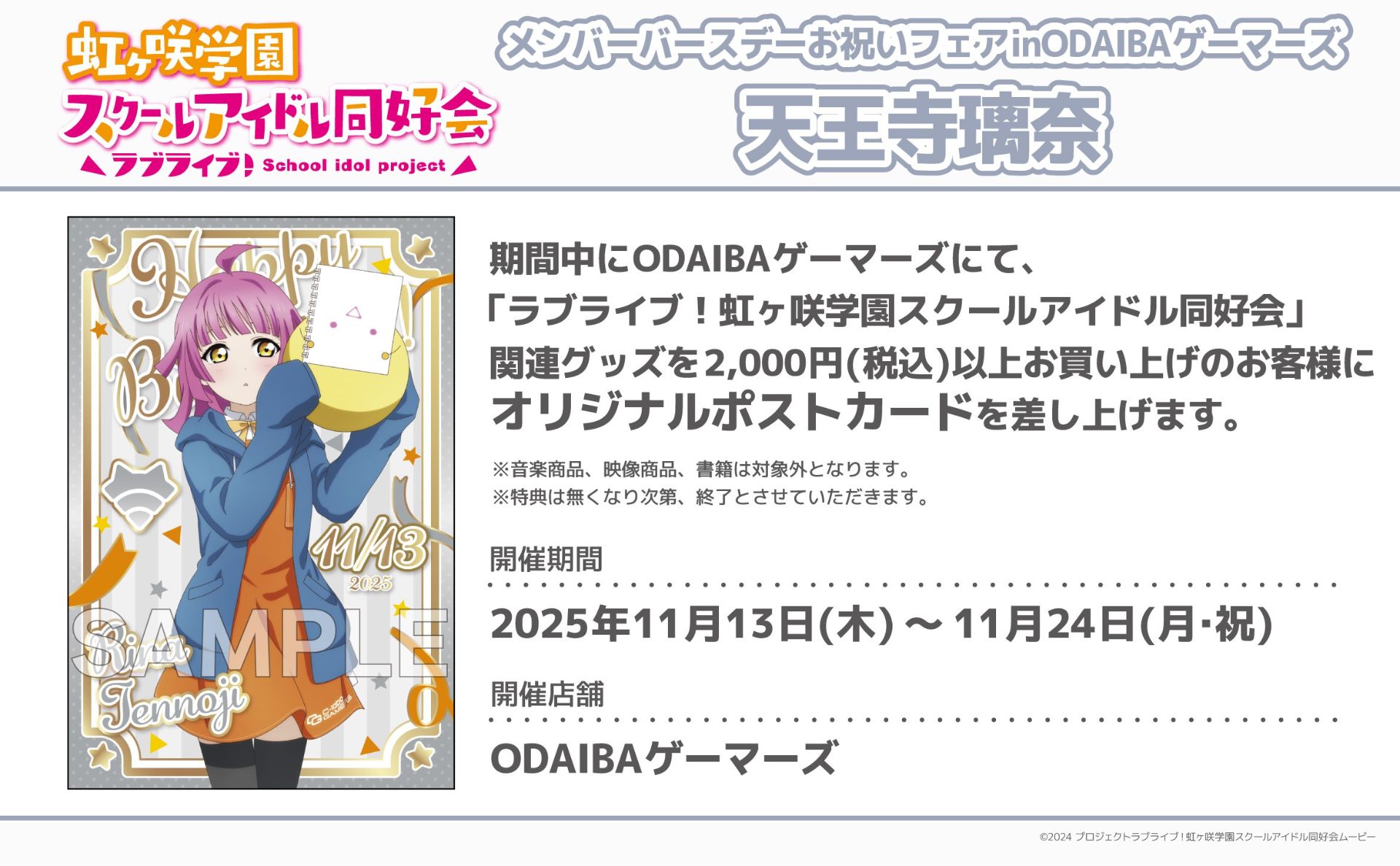 ODAIBAゲーマーズより「ラブライブ!虹ヶ咲学園スクールアイドル同好会」メンバーバースデーお祝いフェア開催のお知らせ